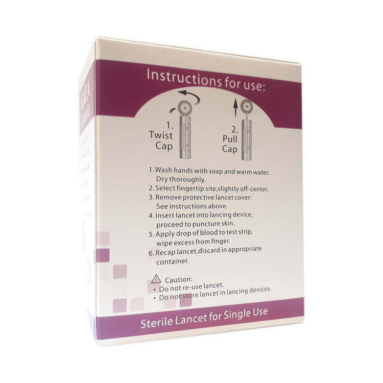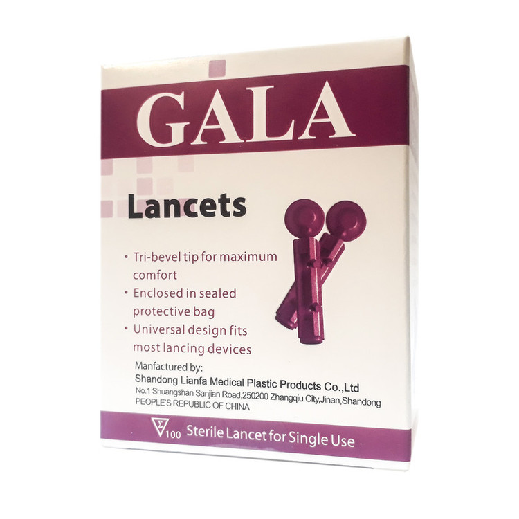 بسته ۱۰۰ عددی سوزن استریل یکبار مصرف تست قند خون گالا مدل 30G که در بیشتر دستگاههای تست قند خون قابل استفاده است. این محصول دارای استانداردهای CE و FDA و ISO13485 می باشد. سوزن ها دارای کاور محافظ هستند که به راحتی برداشته می شوند. نوک سوزن ها به شکل مخروطی است که حداکثر راحتی را در هنگام خون گیری خواهد داشت.