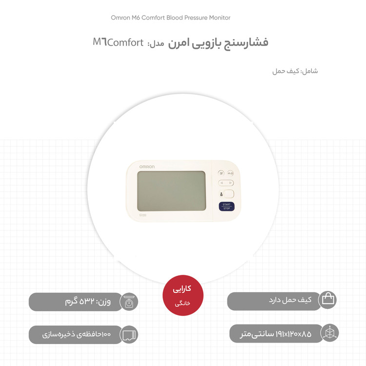 فشارسنج دیجیتال بازویی امرن مدل m6 comfort فشارسنج دیجیتالی بازویی Omron M6 Comfort یک ابزار حیاتی برای اندازهگیری فشار خون است که به آسانی و دقت بالا این عمل را انجام میدهد. این دستگاه با قابلیت اندازهگیری دقیق فشار خون، به کاربران اطلاعات قابل اعتمادی درباره سلامت قلب و عروق ارائه میدهد. با استفاده از فناوری دیجیتال و دقت بالای خود، فشارسنج Omron M6 Comfort به راحتی و با دقت بالا، اندازهگیری فشار خون را انجام میدهد و اعداد دقیقی را به کاربران ارائه میدهد. این فشارسنج با طراحی بازویی خود، امکان استفاده آسان و راحت را برای کاربران فراهم میکند، همچنین با توجه به دقت بالای خود، اطلاعات دقیق و قابل اعتمادی را به کاربران ارائه میدهد. اندازهگیری منظم فشار خون با استفاده از این دستگاه، میتواند به کنترل سلامت قلب و عروق کمک کند و به کاربران اطمینان بخشد که فشار خون آنها در حد صحیحی قرار دارد. در نتیجه، فشارسنج دیجیتالی بازویی Omron M6 Comfort با امکانات ویژه خود، به عنوان یک ابزار ضروری و حیاتی برای افرادی که به پایش فشار خون خود نیاز دارند، توصیه میشود. این دستگاه با دقت و قدرت خود، به کاربران امکان اندازهگیری دقیق و قابل اعتماد فشار خون را میدهد و به آنها اطلاعات لازم برای حفظ سلامتی قلب و عروق خود را فراهم میکند. مزایای استفاده از فشارسنج دیجیتالی استفاده از فشارسنج برای اندازهگیری فشار خون از اهمیت بسیاری برخوردار است. اندازهگیری دقیق فشار خون از اهمیت زیادی برای حفظ سلامتی و پیشگیری از بیماریهای قلبی-عروقی برخوردار است. با داشتن فشارسنج دیجیتالی میتوان به راحتی فشار خون خود را در خانه یا حتی در مسافرت اندازهگیری کرد و مشکلات مربوط به فشار خون را به موقع تشخیص داد. فشارسنجهای دیجیتالی به دلیل دقت بالا و اعتمادپذیری اعداد نمایش داده شده، ترجیح بیشتری نسبت به فشارسنجهای مکانیکی دارند. این امر باعث میشود که افراد بتوانند به دقت بالای اعداد نمایش داده شده اعتماد کنند و تصمیمات مربوط به سلامتی خود را بر اساس این اعداد اتخاذ کنند. همچنین، دیگر نیازی به تنظیم دستی فشارسنج نیست و این به دقت بیشتر اندازهگیری فشار خون کمک میکند.