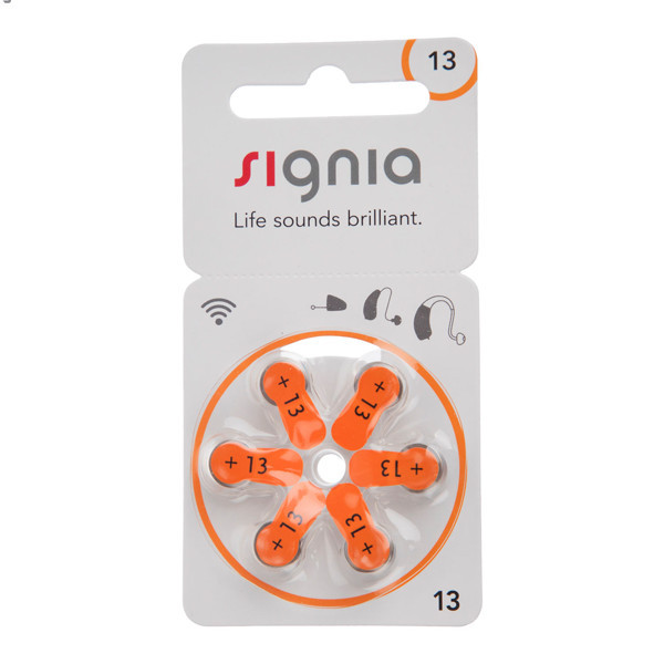 باتریهای سمعک در سایزهای مختلفی تولید میشوند که بارنگهای زرد، آبی، نارنجی و قهوهای نمایش داده میشوند. این باتریها توسط شرکتهای گوناگونی تولید میشوند؛ «سینیا» (Signia) یکی از تولیدکنندگان بزرگ باتری سمعک که محصولات خود را تحت لیسانس شرکت «زیمنس» طراحی و تولید میکند. باتری سمعک کد 13 محصولی از این برند است که در سایز 13 و با رنگ نارنجی روانه بازار شده است. در این باتریها از فناوری روی-هوا استفاده شده است که با قرار گرفتن در معرض هوا فعال میشود. به این ترتیب اگر برچسب پلاستیکی پشت باتری از آن جدا شود، اکسیژن هوا با فلز روی واکنش نشان میدهد و باعث میشود که باتری به حالت فعال درآید. از اینرو یک برچسب پلاستیکی پشت باتری قرار گرفته است تا باتری در حالت غیر فعال باقی بماند. این مجموعه شامل 5 پک باتری است که تهیه آن نسبت به دیگر محصولات، مقرونبهصرفه است.